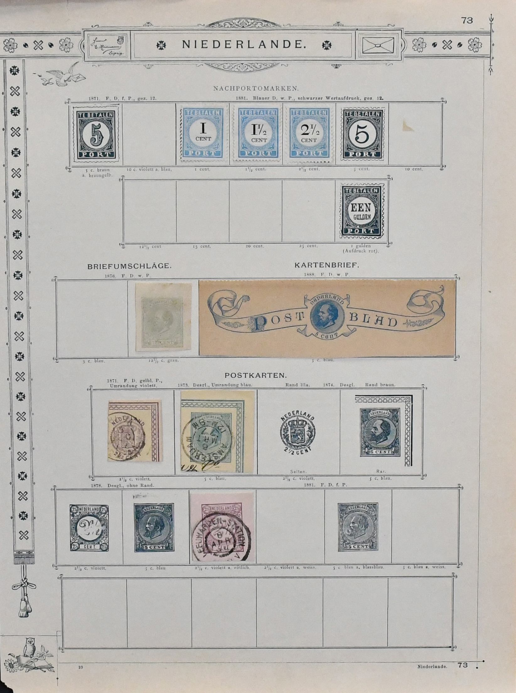 Niederlande, 1852-1876, sauber gest. Slg. in oft guter Erhaltung auf alten Goldschnitt-Vordrucken, dabei u.a. Nr. 1-3, 4-6, 7-11, 16, 29 usw., auch etwas Portomarken, Ganzsachen-Abschnitte, sowie Postanweisungsmarken Nr. 1-7 enthalten. Mi. 1400,-