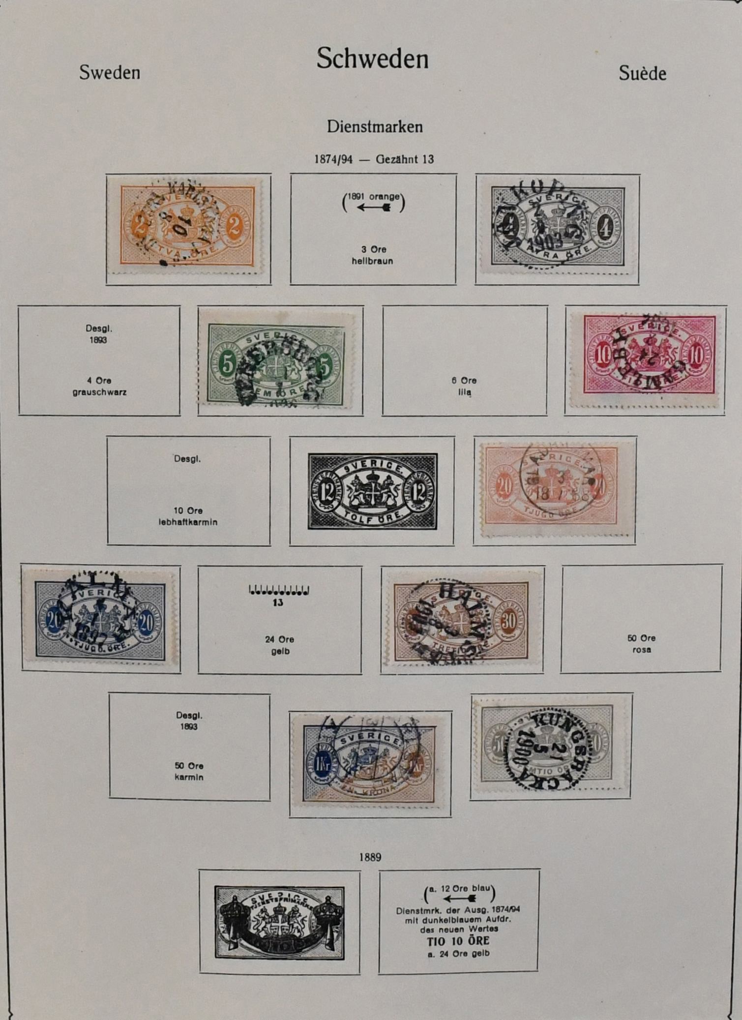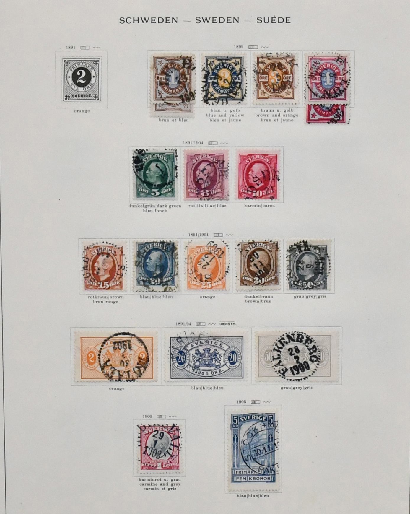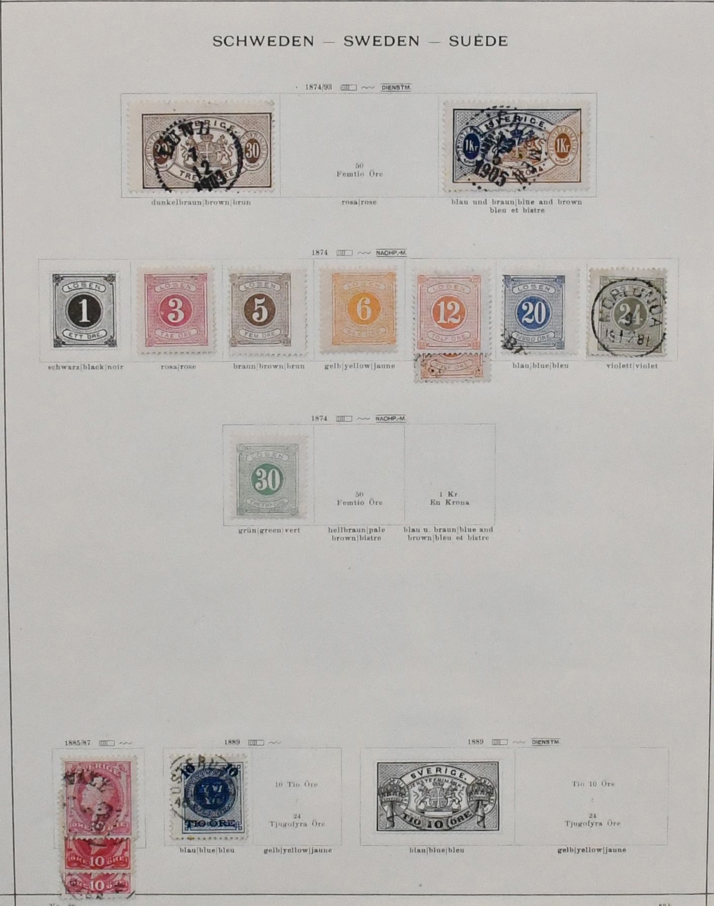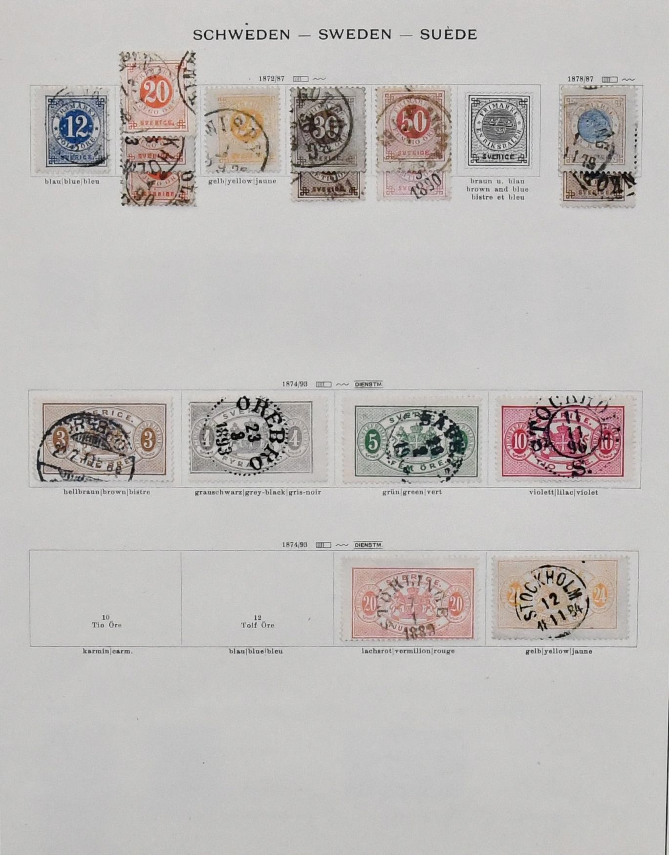 Schweden, 1858-1911, meist gest. Slg. in überwiegend guter Erhaltung auf alten Schaubek-Vordrucken, dabei u.a. Nr. 7b, 9a, 10a, 11, 14II, 16, 17-25, 27, 54 usw. Ferner Dienst- und Portomarken, z.B. P7cA