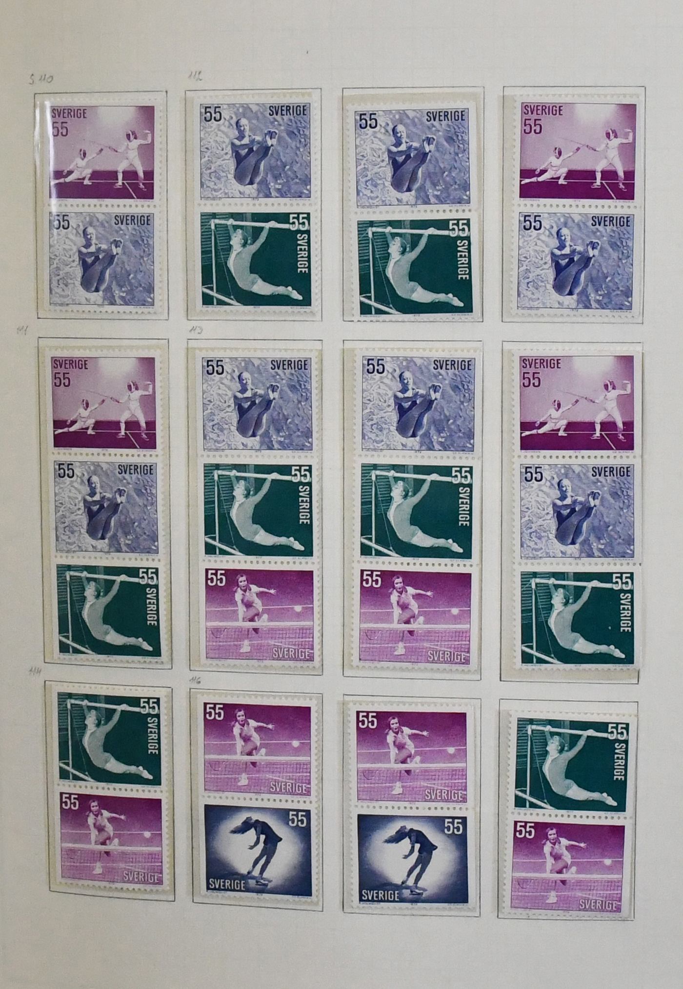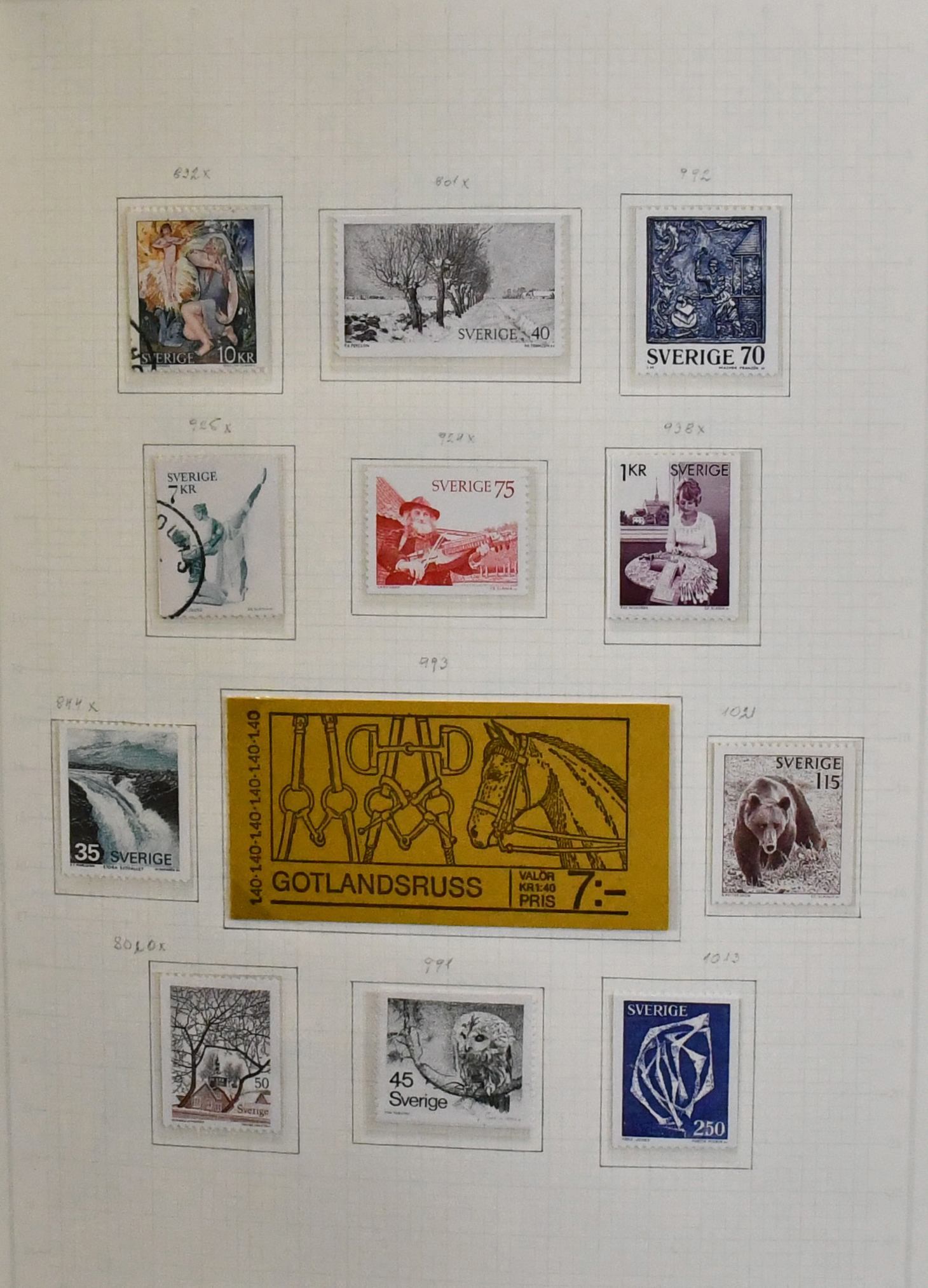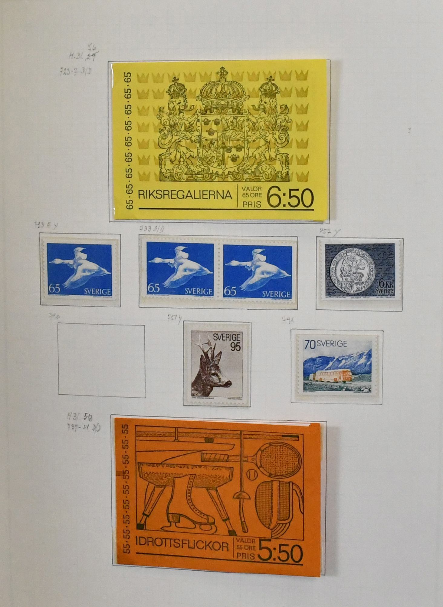 Schweden, Slg. von etwa 1500 Werten, anfangs gestempelt, ab 1970 zunehmend auch postfrisch, vieles nach Zähnungen spezialisiert, im KABE-Vordruckalbum und später auf Blankoblättern