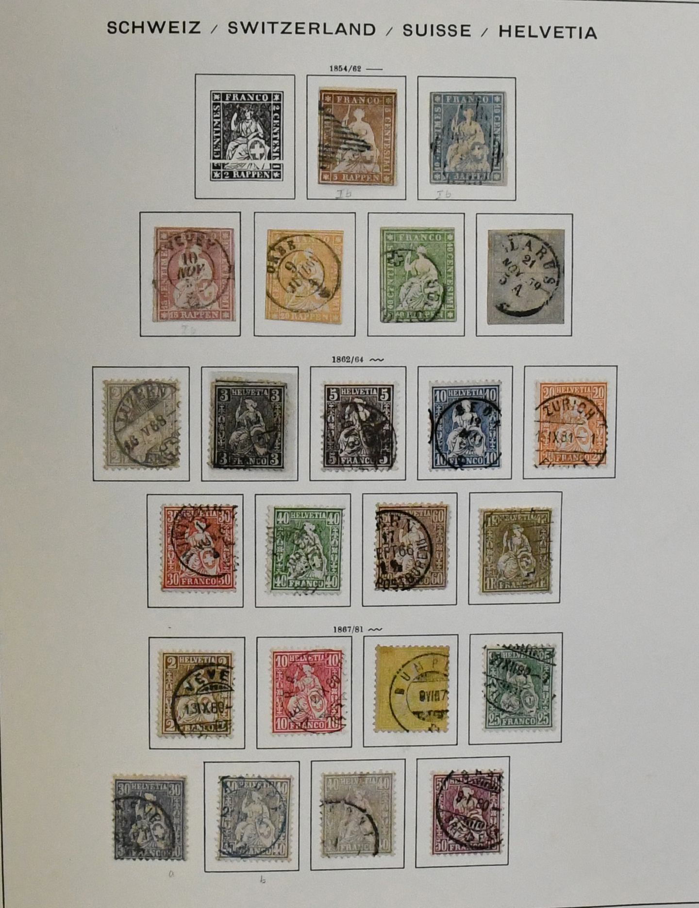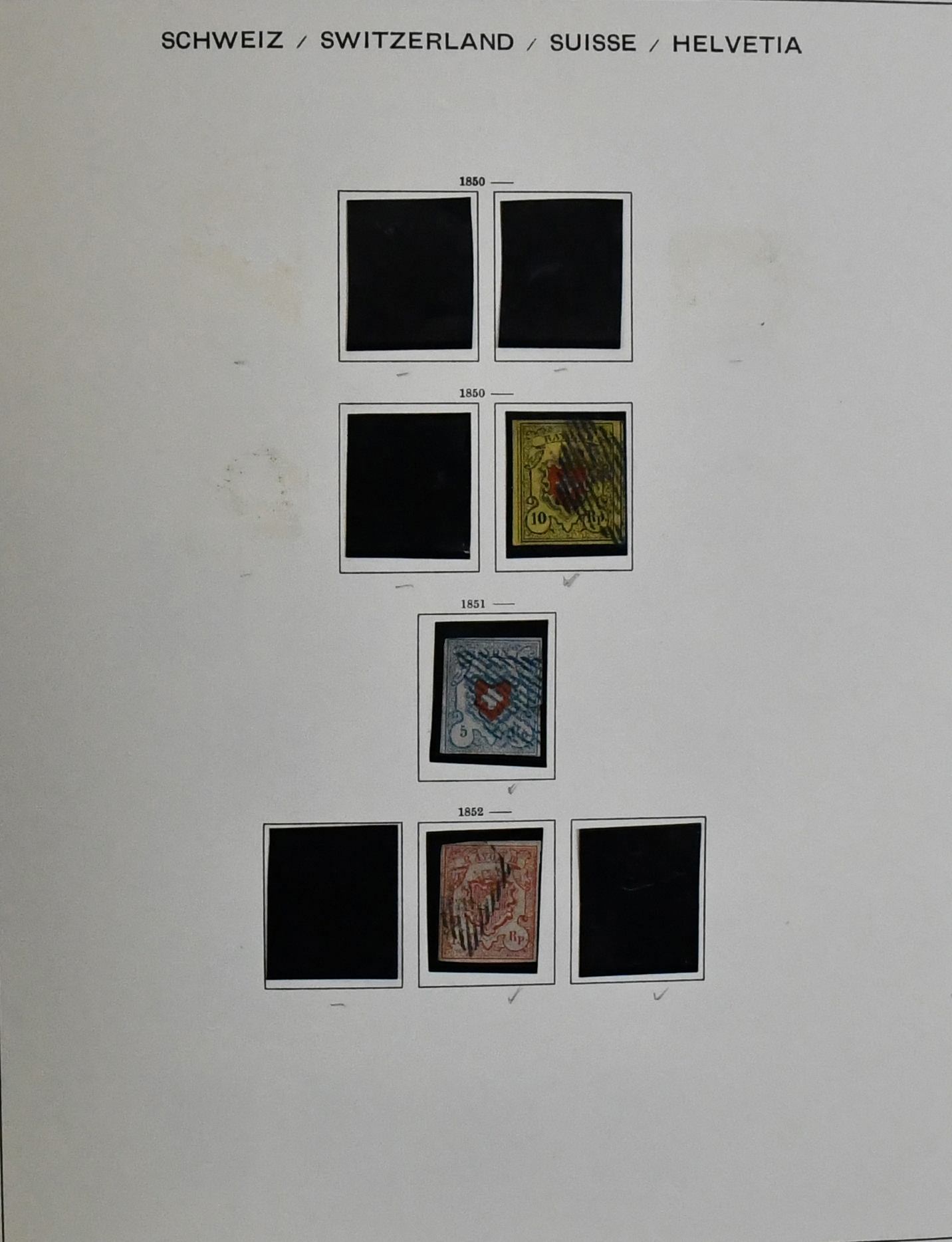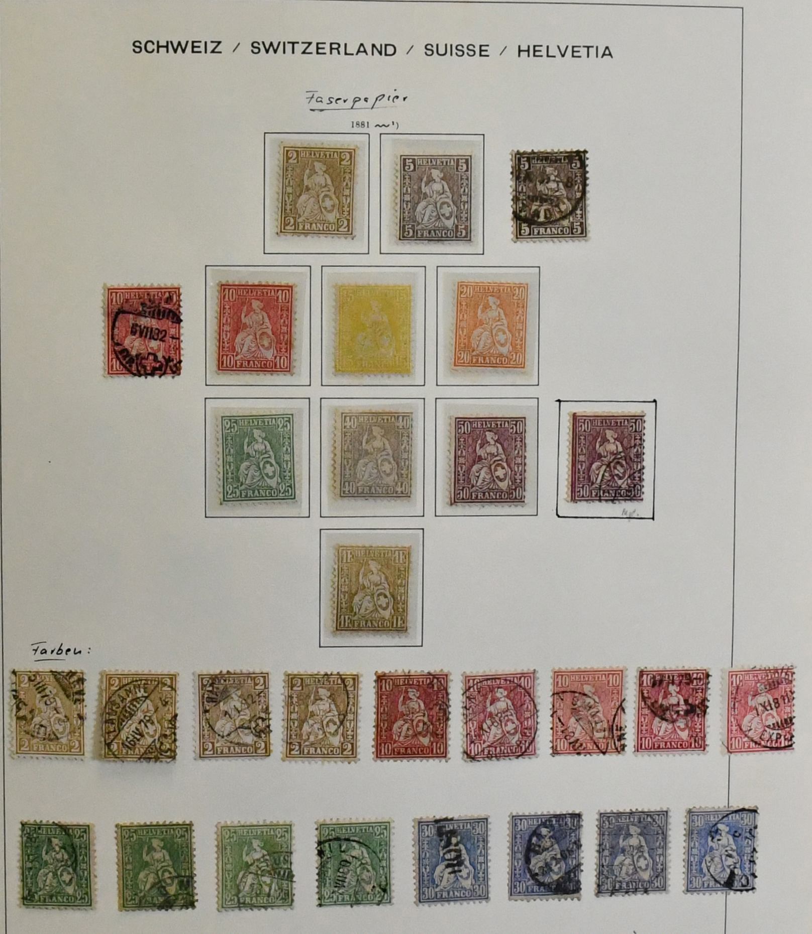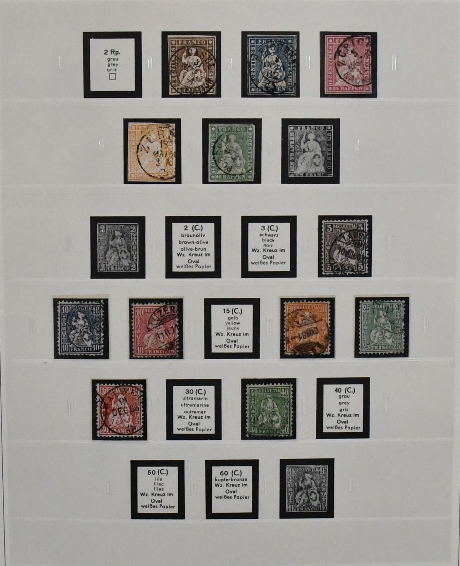 Schweiz, 1843-1920, meist gestempelte Slg. in überwiegend guter Erhaltung auf alten Schaubek-Vordrucken. Dabei eine "Zürich 6" (Mi.-Nr. 2II) auf sehr seltenem Brief von Wald (Gemeinde im Züricher Oberland) nach Zürich (vom 21.10.1846), da die Marke senkrecht nicht mit der Schere getrennt, sondern gerissen wurde, leider nicht perfekt. Dazu eine weitere "Zürich 6" mit klarem rotem Rosettenstempel, allerdings beschädigt und daher unberechnet. Ferner die Rayons inkl. Nr. 7II mit Federzug-Entwertung und ungest., Nr. 8II(2), 9 gest. und ungest., 12(2), Strubel mit Nr. 19 gest., 13-17 teils mehrfach und oft gut geschnitten, sitzende Helvetia mit u.a. Nr. 21, 39 u. 40, je gest., Pro Juventute 1913-1920 gest. kpl., Nr. 145 u. 152 je ungebr., usw. Hochwertiges und interessantes Objekt