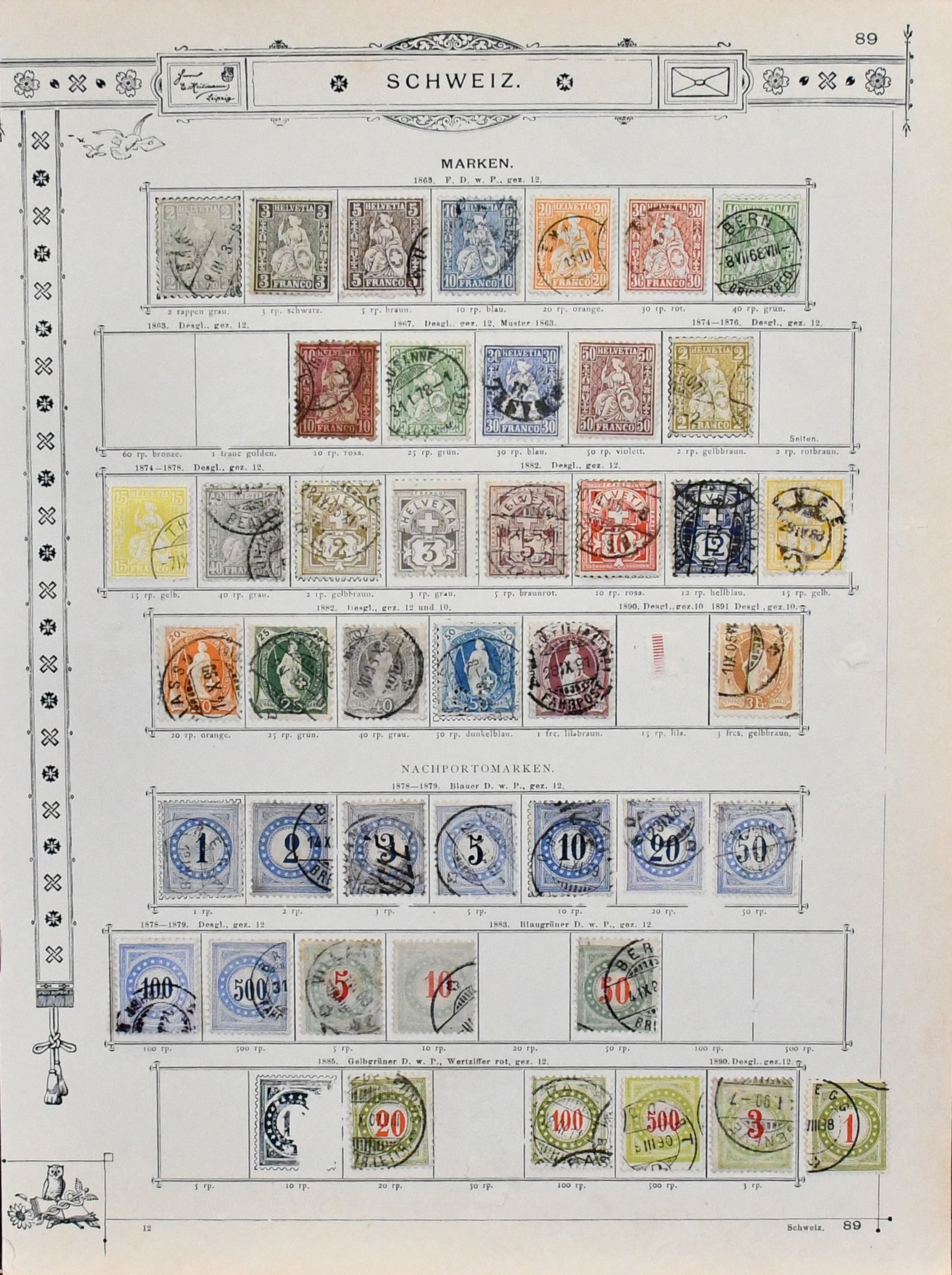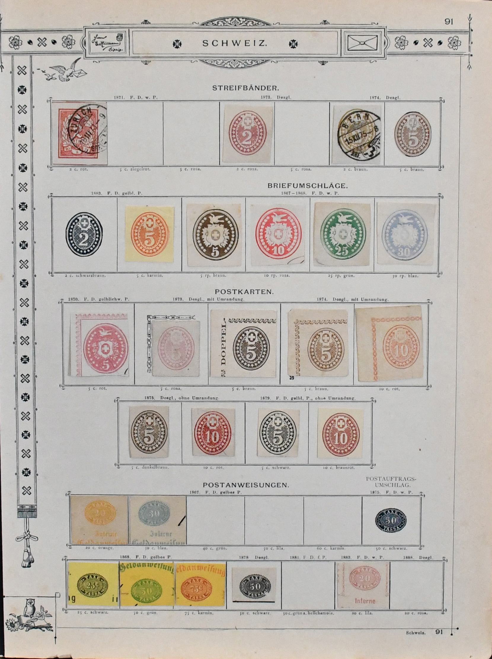 Schweiz, 1850-1882, fast ausschließlich gest. Slg. in etwas untersch. Erhaltung auf alten Goldschnitt-Vordrucken, dabei u.a. Nr. 7-8, 9, breitrandige Nr. 11 (Mi. 950,-), 12, 13-17, 19, 25-26, 31, 56 usw., ferner Portomarken und Ganzsachen-Abschnitte. Mi. 2700,-
