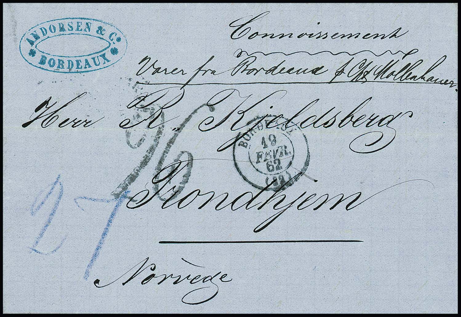 "Frankreich-Norwegen", frischer Brief 1862 mit K2 von Bordeaux und seltenem Taxstempel "26" nach Trondheim
