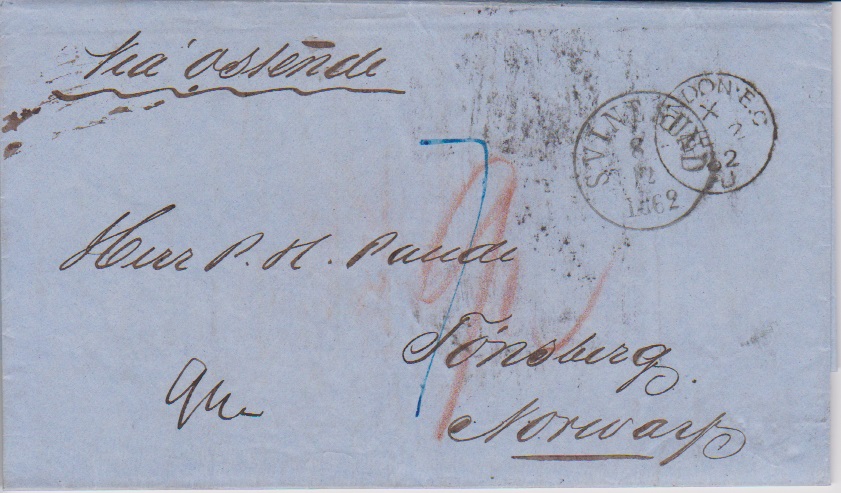 "England-Norwegen", 1860, zwei Briefe aus gleicher Korrespondenz von London nach Tönsberg, via Hamburg (rs. entspr. Stempel), Taxen "36" bzw. "38" Sk.