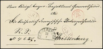 "B.S.P.", roter L1 bzw. rotvioletter Ovalstempel (2) für bayerische Auslands-Dienstpost auf drei Auslands-Dienstbriefen von Germersheim bzw. Bergzabern 1861-64 je nach Weißenburg/Frankreich