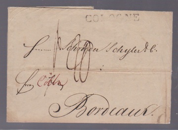 "Cologne", 1815, der L1 als Transitstempel verwandt auf Brief aus Magdeburg "frco. Cölln" nach Bordeaux