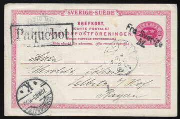 "Fra Sverige", Ra1 bzw. L2 ("M.") auf zwei Schweden-Postkarten (eine leichte Feuchtigkeitsspur) nach Deutschland 1900/1901, je Nebenstempel "Paquebot"