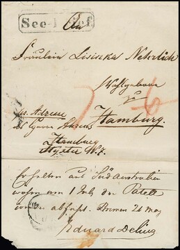 "Australien-Hamburg", (1850), Ra1 "See-Brief" auf Brief mit rs. hs. Vermerk "Erhalten aus Südaustralien wohin am 1. Juli von Patell wieder abfährt. Bremen 21. May" nach Hamburg