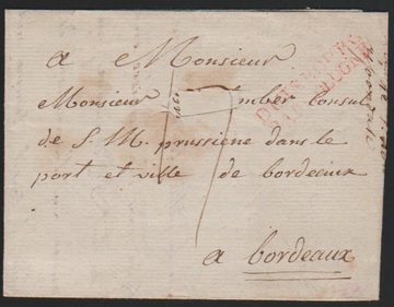"Duisbourg par Cologne", 1801, klarer roter L2 auf Brief (kl. Ausschnitt) aus Duisburg nach Bordeaux, Feuser 500,-