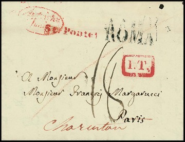 "St. Pontef", roter L1 auf Brief 1828 von Rom mit L1 "L.T." und Ovalstpl. "Autriche par Huningue" nach Paris