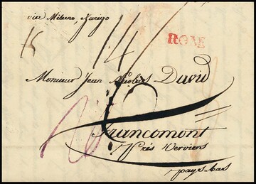 "Kirchenstaat-Belgien", 1820-23, drei Briefe je mit seltenem rotem L1 "Rom", hs. "via milano et Zurigo", nach Francomont bei Verviers