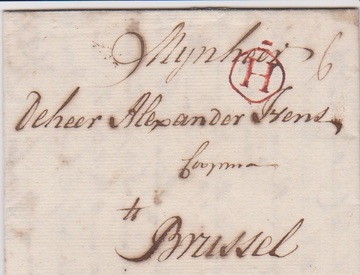 "H", rotvioletter Einkreiser auf Faltbrief 1775 von Rotterdam nach Brüssel, Taxe "6" Stuiver