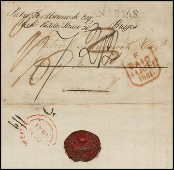 "Kanarische Inseln-Belgien", 1841, L1 "Canarias" auf Brief aus Santa Cruz de Teneriffe via englischem Forwarder in Norwich nach Brügge/Belgien und von dort nach Norwich zurück
