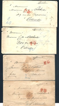"R. Front", roter Ra1 auf Brief aus Chimay 1848, blauer Ra1 "B.2.R.", sowie zwei Briefe aus Tamise bzw. Antwerpen, dreimal nach Vervins, einmal nach Valenciennes, je Frankreich