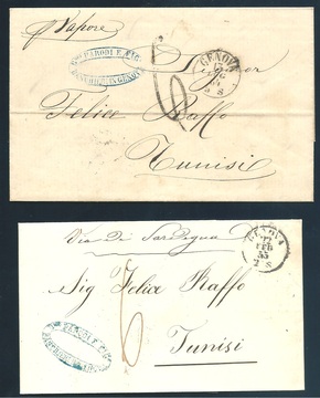 "Italien-Tunesien", 1855/64, zwei Briefe je mit K1 "Genova" per Schiffspost nach Tunesien, versch. Stempel