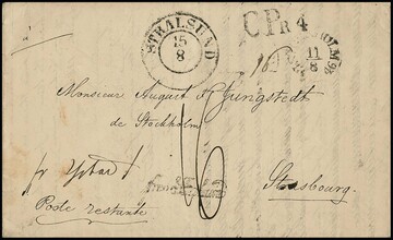 "Stralsund", 1846, sowohl K2 als auch Schreibschrift-L1 "frco. Stralsund" auf Brief mit Aufgabe-K1 "Stockholm" via Stralsund nach Straßburg/Frankreich