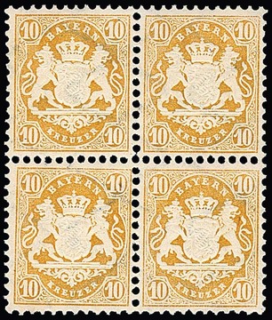 10 Kr. dunkelgelb, gutes Wasserzeichen, im seltenen ungebrauchten Viererblock, die linke untere Marke postfrisch, die rechte untere mit winzig heller Stelle, sonst gut. Mi. 2200,- für Falz-Viererblock bzw. 1550,- für die drei losen tadellosen Marken. Attest Schmitt