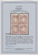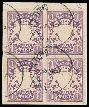 1 Mk. violett, seltener, postalisch gebrauchter Viererblock auf Prachtbriefstück mit K1 von Neustadt a.D., alle Zähne vorhanden, lediglich bei der rechten oberen Marken zwei Zahnspitzen gering verkürzt. Gut sign. Schmitt, Pfenninger und Attest Sem. Mi. 1200,-