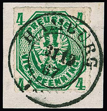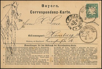 Ganzsachen-Ausschnitt 5 Pfg. grün aus Postkarte in seltener Verwendung auf typisch gef. Correspondenzkarte mit K1 "Nürnberg" 1877 nach Hamburg. Sign. Pfenninger und Attest Sem