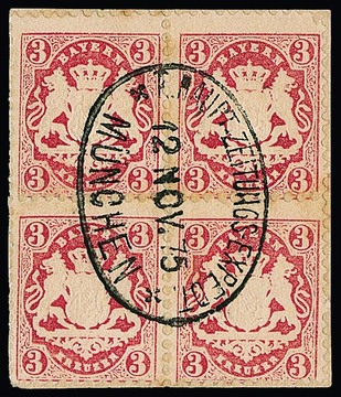 3 Kr. rosa, sehr seltener Viererblock (rechte obere Marke oben rechts "eckrund") auf Briefstück mit vollem, zentrischem Zier-Ovalstempel "K. Hauptzeitungs-Expedt. München" vom 12. Nov. 1875