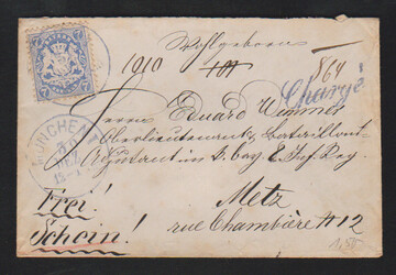 7 Kr. blau einzeln auf etwas getöntem Chargé-Couvert von München, Dez. 1872, an einen Oberleutnant im bayer. Inf.-Regt. in Metz (rs. K1)