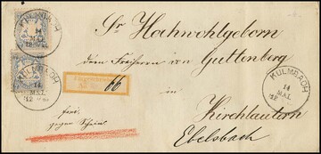 7 Kr. blau per zwei (einmal unauffälliger Einriß) auf eingeschriebenem Doppelbrief (ohne Seitenklappen) mit K1 "Kulmbach" und erstem R-Zettel an den Freiherrn von Guttenberg in Kirchlautern, sign. Sem