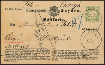Ganzsachenkarte 2 Kr. grün 1873 als Teilfranko-Einschreibekarte (Gebrauchserhaltung) mit K1 "Garmisch" nach Stuttgart, L1 und hs. "Chargé", Recogebühr von 7 Kr. bar bezahlt