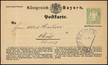 Ganzsachenkarte 2 Kr. grün (links Bugspur und typischer Aktenspieß) in seltener Verwendung als unterfrankierte Auslandskarte mit blauem HK "Kaufbeuren" 1873 nach Chur/Schweiz, ohne Nachtaxe (Porto 3 Kr.), Fotoexp. Stegmüller