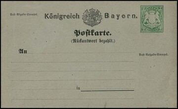 Ganzsachen-Doppelkarte 2 Kr. grün ungebraucht (in der Faltung typisch etwas angetrennt), sehr seltene Abart mit fehlendem Wertstempel auf dem Antwortteil, bisher einzig bekanntes Exemplar