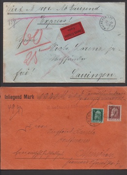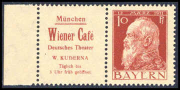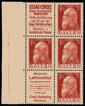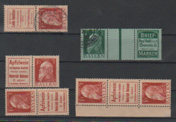 10 Pfg. Luitpold, senkrechter Reklame-Zusammendruck "Leih-Institut" gestempelt, dazu drei Reklame-Zusammendrucke "Apfelwein" inkl. S7.5 ungebraucht, Mi. 390,-