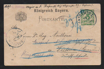 Sonder-Ganzsachenkarte 5 Pfg. grün ("Bayer. Landes-Ausstellung Nürnberg") 1904 gebraucht von Bayreuth nach Victoria/Kamerun und retour (!), links oben Bug