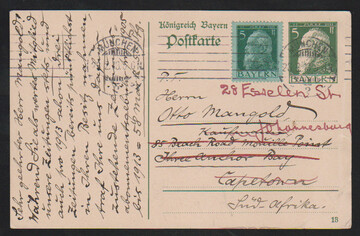 5 Pfg. Luitpold auf Ganzsachenkarte 5 Pfg. von München 1913 nach Kapstadt/Südafrika gelaufen und dort inländisch nachgesandt