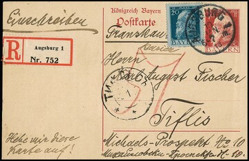 20 Pfg. Luitpold (ein Zahn) auf Ganzsachenkarte 10 Pfg. rot, von Augsburg 1913 als sehr ungewöhnliche Einschreibekarte nach Tiflis/Transkaukasien