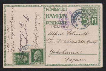 5 Pfg. Luitpold per zwei auf Ganzsachenkarte 5 Pfg. von Ludwigshafen, 10.3.1911, nach Yokohama/Japan. Sowohl für die Marken als auch die Karte Ersttag!