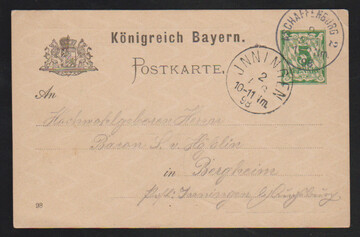 Privat-Ganzsachenkarte 5 Pfg. grün mit Zudruck "Aschaffenburg - 25. Jubiläum des Krieger- & Veteranen-Verein" gebraucht 1898 aus Aschaffenburg