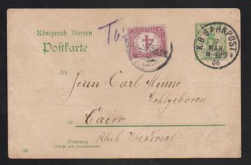 Ganzsachenkarte 5 Pfg. grün mit Bahnpost-K1 "München-Kufstein" 1906 als Auslandskarte nach Cairo/Ägypten, dort ägypt. Portomarke 4 Mill. nachfrankiert, typische Gebrauchsspuren