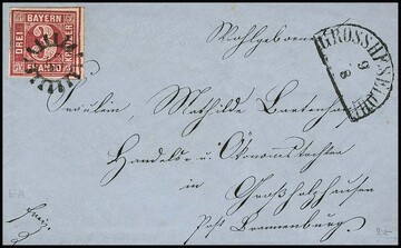 "15", oMR nebst L2 "Amberg" auf Brief (dieser in den Falten ausserhalb Papiermängel) mit zwei Kabinett-Randstücken 3 Kr. rosa und 6 Kr. hellblau