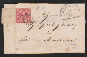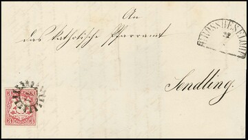 "51", gMR nebst HK "Bobingen" auf etwas unfrischem Brief mit Prachtstück 3 Kr. rosa, diese mit links 2cm breitem, um den Briefrand geklebten Bogenrand
