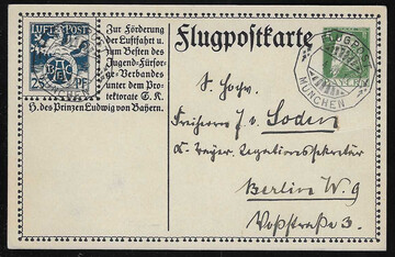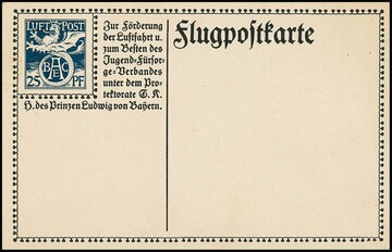 Sonderflugpost-Ganzsachenkarte 25 Pfg. ohne Eindruck des Wertstempels 5 Pfg. Luitpold tadellos ungebraucht, lt. Literatur nur 200 Ex. hergestellt, die als Geschenk an Ehrengäste verteilt wurden. Mi. 600,-