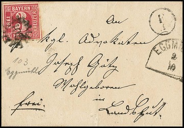 "103", gMR nebst HK von Eggmühl und kleinem Briefträgerstempel "E1" auf Prachtbrief 3 Kr. rosa