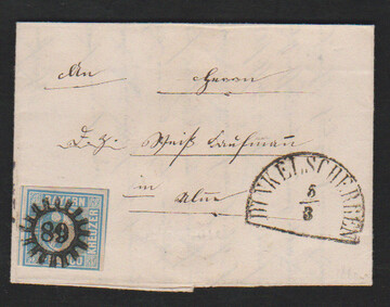 "43", gMR nebst HK "Grossheselohe" klar auf Faltbrief (rs. ganz gering verkürzt) mit perfekter Wappen 3 Kr. (mit Plattenfehler links oben), seltener Brief in der 3. Verteilung