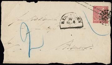 "248", oMR nebst HK "Kissingen" als seltene Fremdentwertung auf NDP-Ganzsachen-Vorderseite 1 Gr. rosa (kl. Randmgl.) mit Nachtaxe "2"