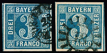 3 Kr. blau, Platte I, breitrandiges Kabinettstück mit gMR "18", sowie Prachtstück mit besserem Fingerhut-K1 "Burghausen", sign. Sem bzw. Schmitt