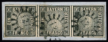 1 Kr. schwarz, Platte II, im waagerechten Dreierstreifen auf Briefstück mit gMR "121" (Hammelburg). Die mittlere Marke oben geringfügig berührt, sonst vollrandig, "bayernbrüchige" Stellen im Zwischenraum (für Platte II typisch), dadurch links nur noch unten zusammenhängend. Linke Marke kleine Mängel (Bugspuren, Rißchen), rechte tadellos. Attest Brettl: "schön wirkendes Briefstück". Mi. 13.000,-