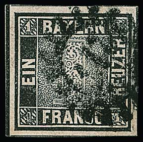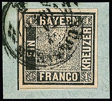 1 Kr. grauschwarz, Platte II, allseits breitrandiges Kabinettstück (vier Schnittlinien!) mit gMR "217" (München) und Plattenfehler "Abspaltung an der rechten Randlinie" (Vogel-Handbuch PFXIII), der nur einmal im 180er-Bogen vorkommt. Sign. mit Befund Thier "Aecht" (um 1910), sowie Attest Sem (2024)