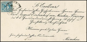 3 Kr. blau auf prachtvoller Bischofsbriefhülle mit HK "Partenkirchen" nach München, Marke mit Plattenfehler über "N von BAYERN" im Rand, Attest Brettl