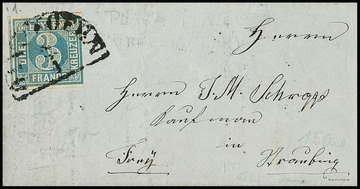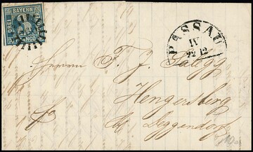 3 Kr. blau, Platte I, auf Prachtbrief mit gMR "260" und HK "Passau", sign. Brettl