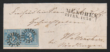 3 Kr. blau, Unterrandpaar auf Kabinettbriefchen aus München 1856