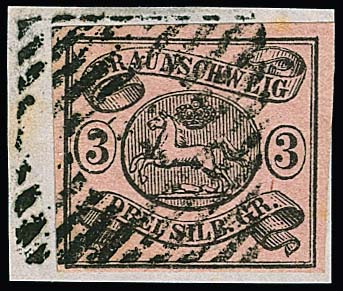 3 Sgr. schw./rosa (oben angeschnitten) in ungewöhnlicher Mischfrankatur mit teils riesenrandigem Kabinettstück 1 Sgr. schw./gelb auf Briefstück (von Auslandsbrief) mit blauem NS "38" von Schöppenstedt, sign. C.H. Lange