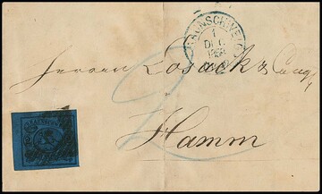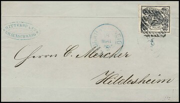 1/3 Sgr. schwarz, repariert, auf vollständiger Drucksache mit Schleife mit NS "9" und K2 "Braunschweig" nach Hildesheim (bekannte "Mercker"-Korrespondenz), Mi. 3200,-