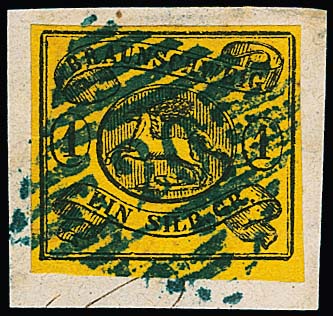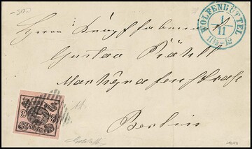3 Sgr. schw./rosa (oben angeschnitten) in ungewöhnlicher Mischfrankatur mit teils riesenrandigem Kabinettstück 1 Sgr. schw./gelb auf Briefstück (von Auslandsbrief) mit blauem NS "38" von Schöppenstedt, sign. C.H. Lange
